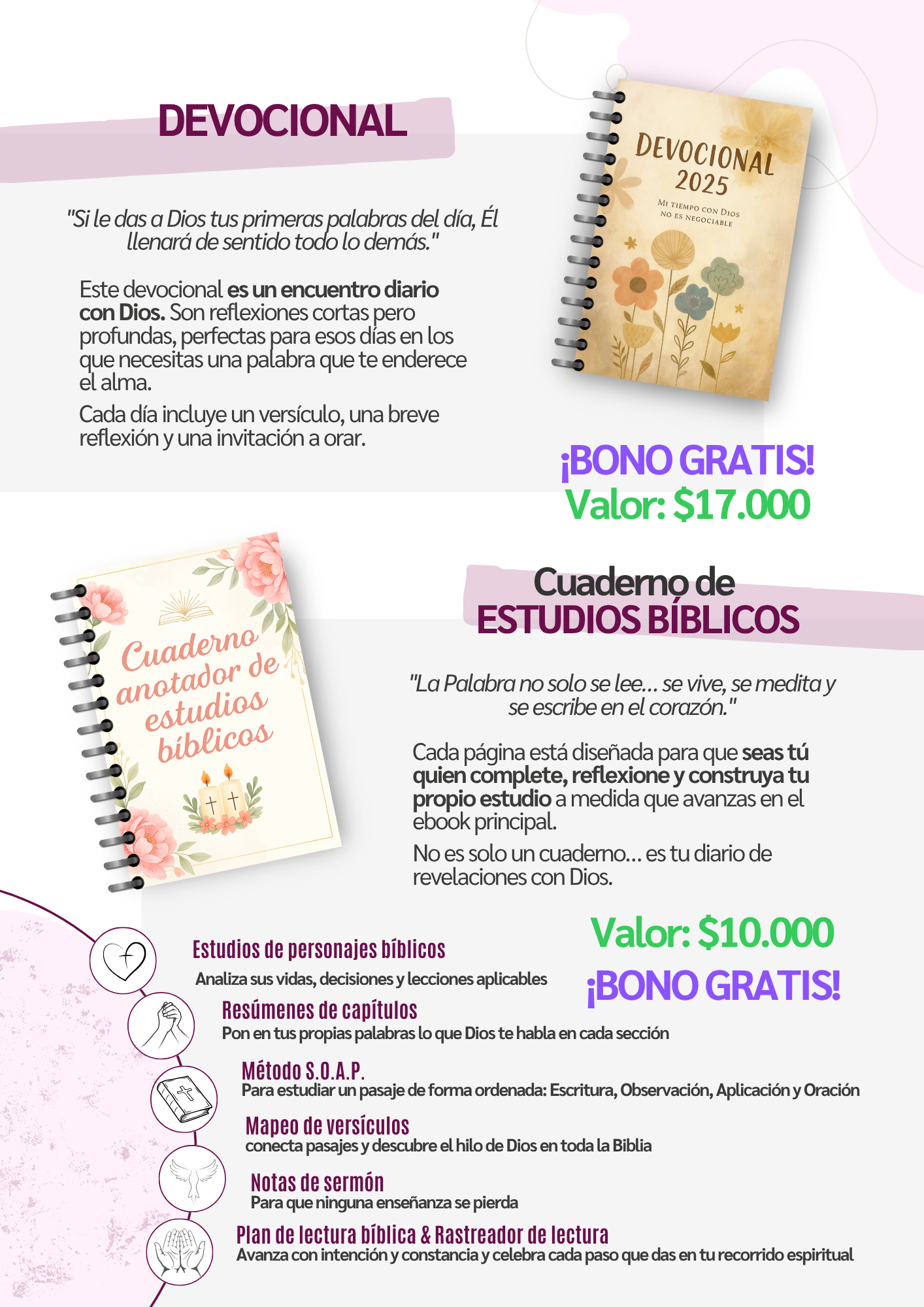 Querés hacer de tu devocional un hábito hermoso y constante, con una didáctica ligera, innovadora y un diseño visual que hace que estudiar la Palabra sea algo que realmente disfrutes.